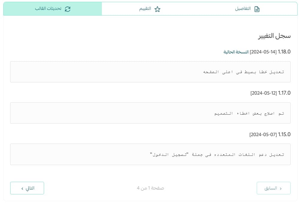 يمكنك معرفة معلومات أكثر عن النسخة الحالية للثيم المثبت، بالإضافة لمعلومات حول النسخ الجديدة الواجب تحديثها من خلال تبويب (تحديثات القالب).